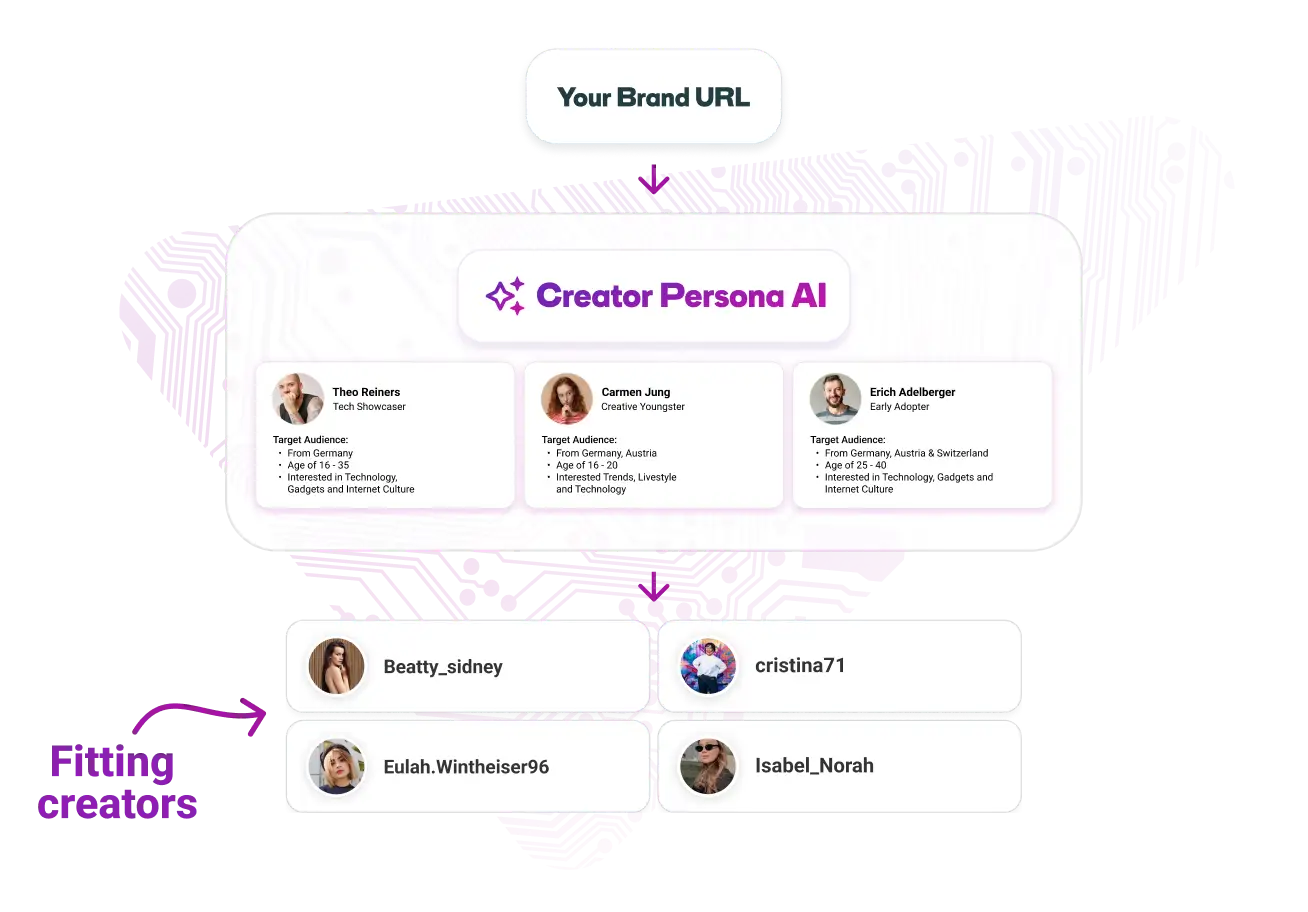 Finde authentische Brand-Fit Creator über Bilder, Text oder URLs. Von "Wer passt?" zu "Los geht's" in Minuten.